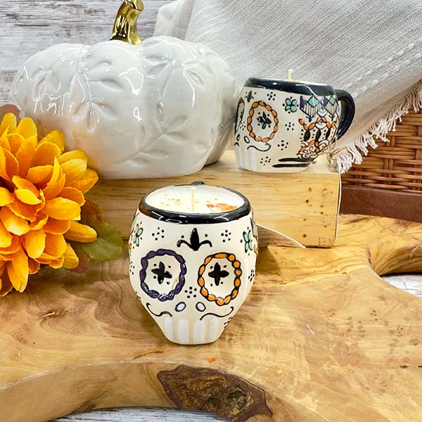 3 oz handcrafted soy candle in a hand-painted ceramic skull mug. Inspired by Día de Muertos, each piece celebrates Mexican artistry with warm, comforting scents. Limited edition.