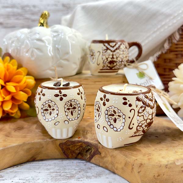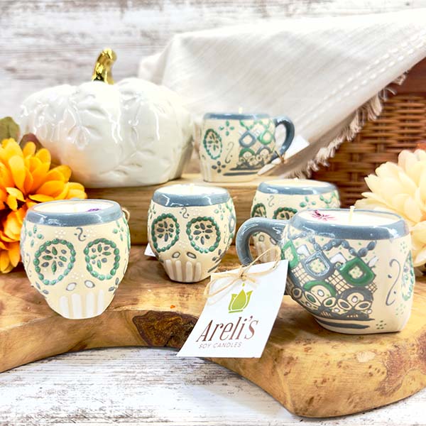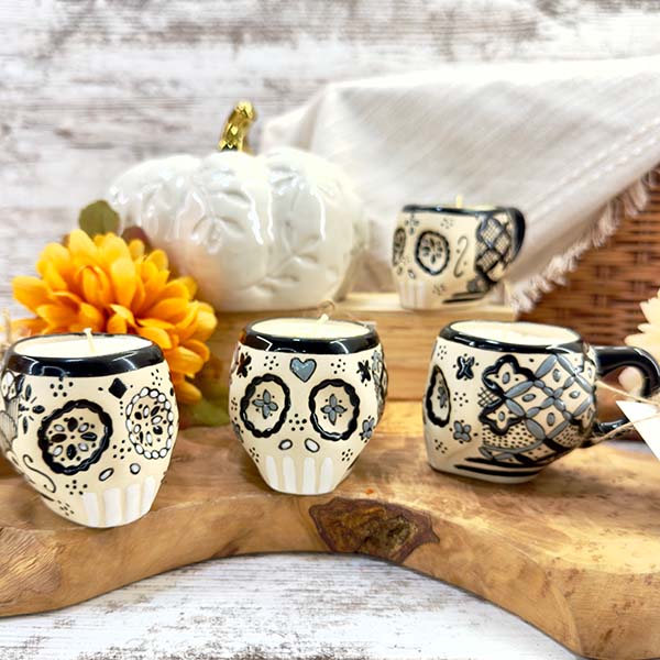 Celebra la tradición mexicana con nuestras encantadoras Mini Taza Calaverita Candles, inspiradas en el arte del Día de Muertos. Cada pieza está elaborada en cerámica pintada a mano, con diseños únicos que rinden homenaje a las coloridas calaveras tradicionales.
